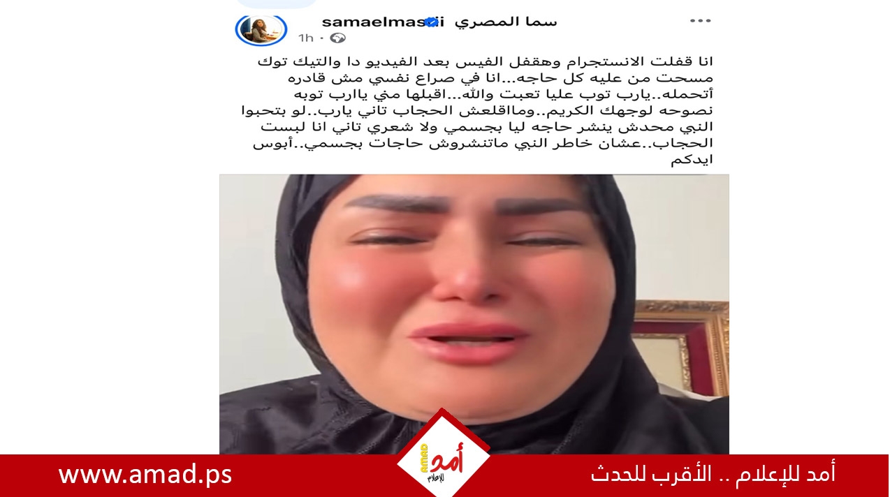 وقالت سما المصري في بث مباشر عبر فيسبوك :"أنا قفلت الانستجرام وهقفل الفيس بعد الفيديو دا والتيك توك مسحت من عليه كل حاجه… أنا في صراع نفسي مش قادره أتحمله.. يارب توب عليا تعبت والله اقبلها مني ياارب توبة نصوحه لوجهك الكريم.. ومااقلعش الحجاب تاني يارب".