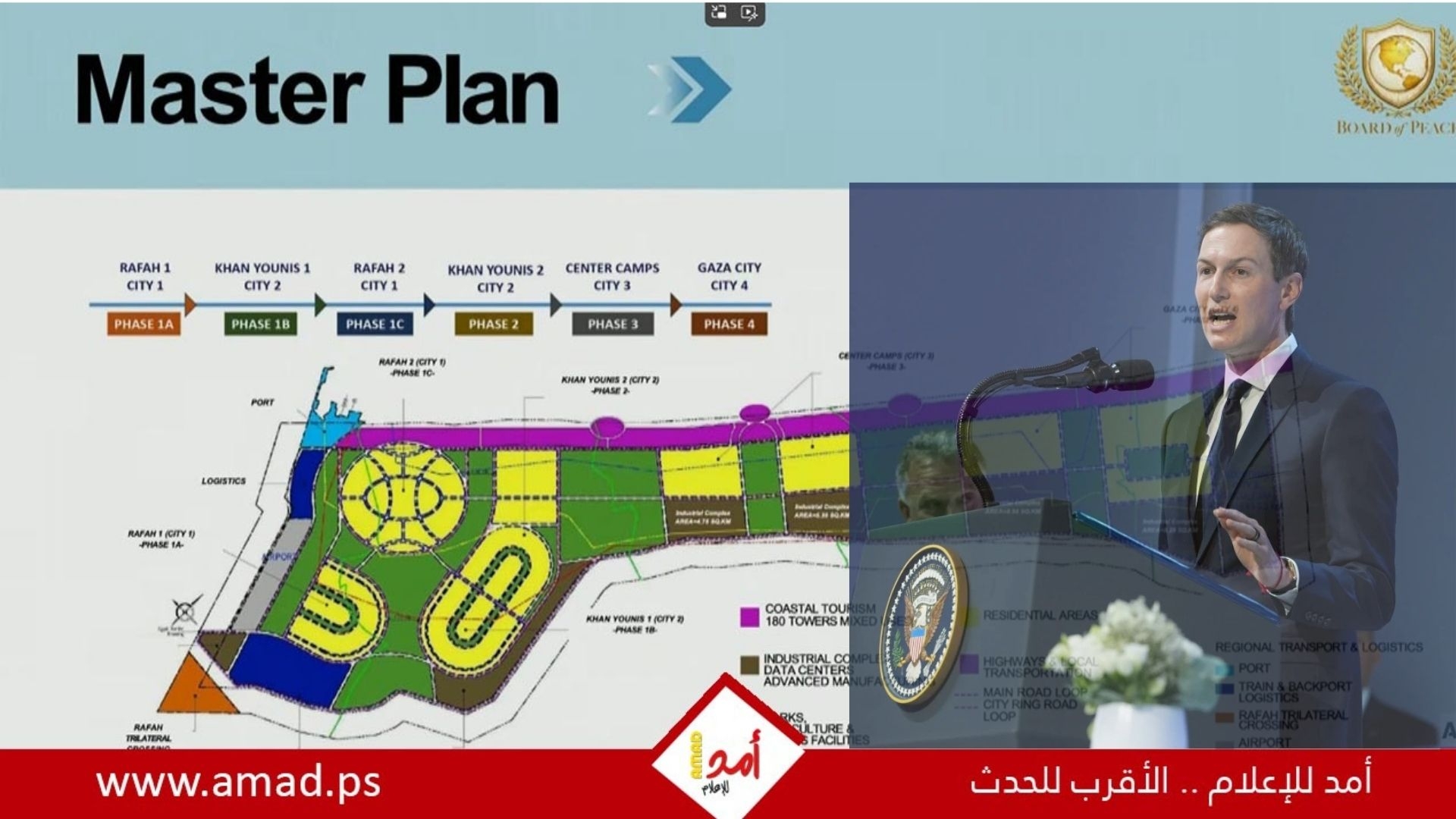 تتضمن رؤية كوشنر لمستقبل غزة إنشاء طرق جديدة ومطار جديد بالإضافة إلى ميناء جديد، ومنطقة ساحلية مخصصة للسياحة، وهي المنطقة التي يقطنها حالياً معظم الفلسطينيين في خيام هشة.