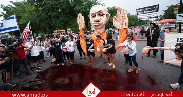 واشنطن: قام متظاهرون أمام البيت الأبيض بالاحتجاج قبيل اللقاء الذي جمع بين الرئيس الأمريكي جو بايدن، ورئيس الوزراء الإسرائيلي بنيامين نتنياهو، وذلك برفع دمية لنتنياهو بيدين ملطختين بالدماء وسكب دماء مزيفة على الشارع أمام البيت الأبيض حيث سيعقد الاجتماع.