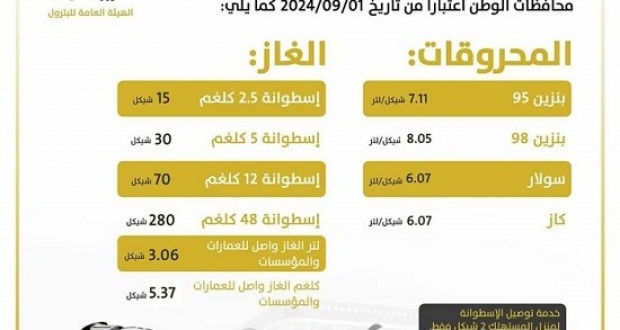 وانخفض سعر لتر البنزين (95 أوكتان)، الأكثر شيوعا واستخداما، بواقع 15 أغورة مقارنة مع أسعار شهر آب/ أغسطس، ليصل إلى 7.11 شيكل. كما انخفض سعر لتر البنزين (98 أوكتان) بواقع 19 أغورة أيضًا ليصل إلى 8.05 شيكل.