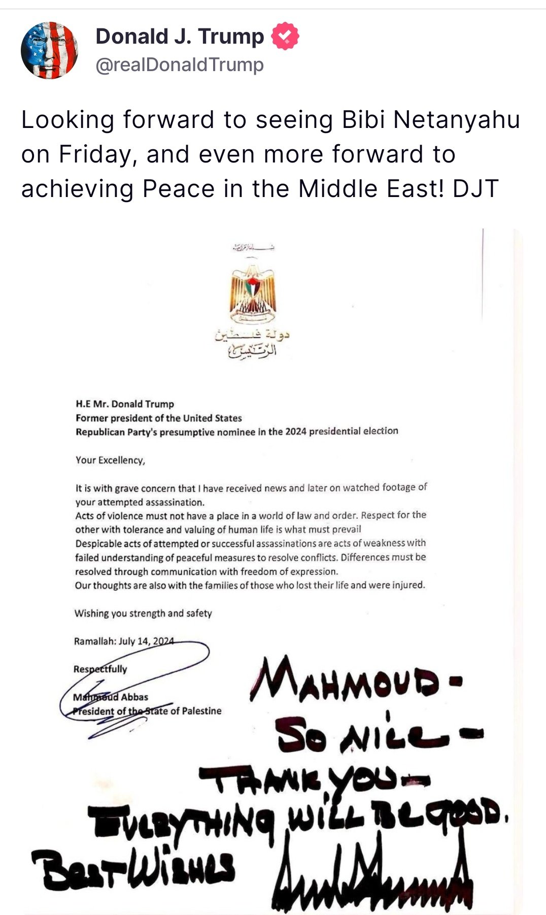 ونشر ترامب على منصته للتواصل الاجتماعي “تروث سوشيال” الرسالة التي تلقاها من عباس، والمؤرخة بتاريخ 14 يوليو، عقب يوم من محاولة اغتيال الرئيس السابق.