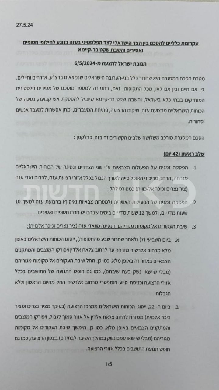 وبحسب الهيئة، فإن الوثيقة تشير إلى أن "إسرائيل تريد التوصل لاتفاق يضمن في النهاية عودة جميع الأسرى أحياء أو أموات مقابل عدد من الأسرى الفلسطينيين، واستعادة السلام المستدام الذي سيؤدي إلى وقف دائم لإطلاق النار بغزة وانسحاب القوات الإسرائيلية من القطاع".