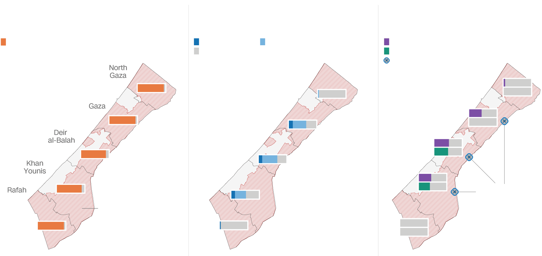 كما أفادت منظمة الأغذية والزراعة (فاو) بأن جميع الأراضي الزراعية في رفح، وتقريبًا جميع الأراضي الزراعية في المحافظات الشمالية، غير قابلة للوصول.