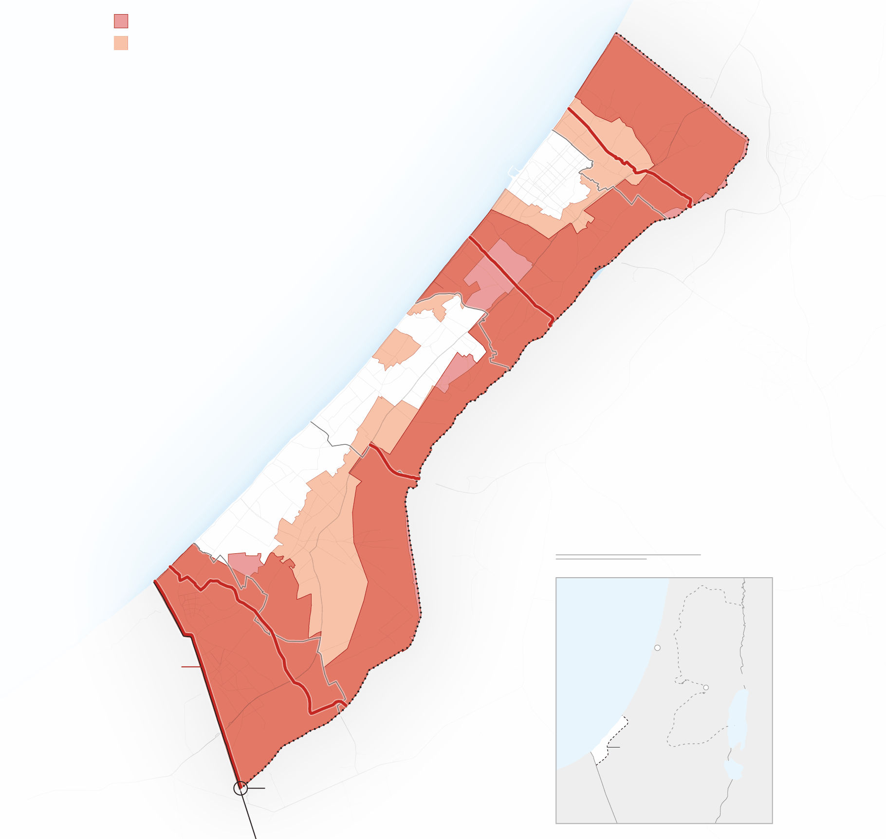 وفقًا للأمم المتحدة، صدرت أوامر إخلاء أو صُنفت منطقة عسكرية لما يقرب من 80% من القطاع منذ 18 مارس، عندما انتهكت إسرائيل وقف إطلاق النار مع حماس، ومنذ ذلك الحين تتبنى إسرائيل سياسة معلنة بدعم من الولايات المتحدة لتشجيع إعادة توطين سكان غزة.