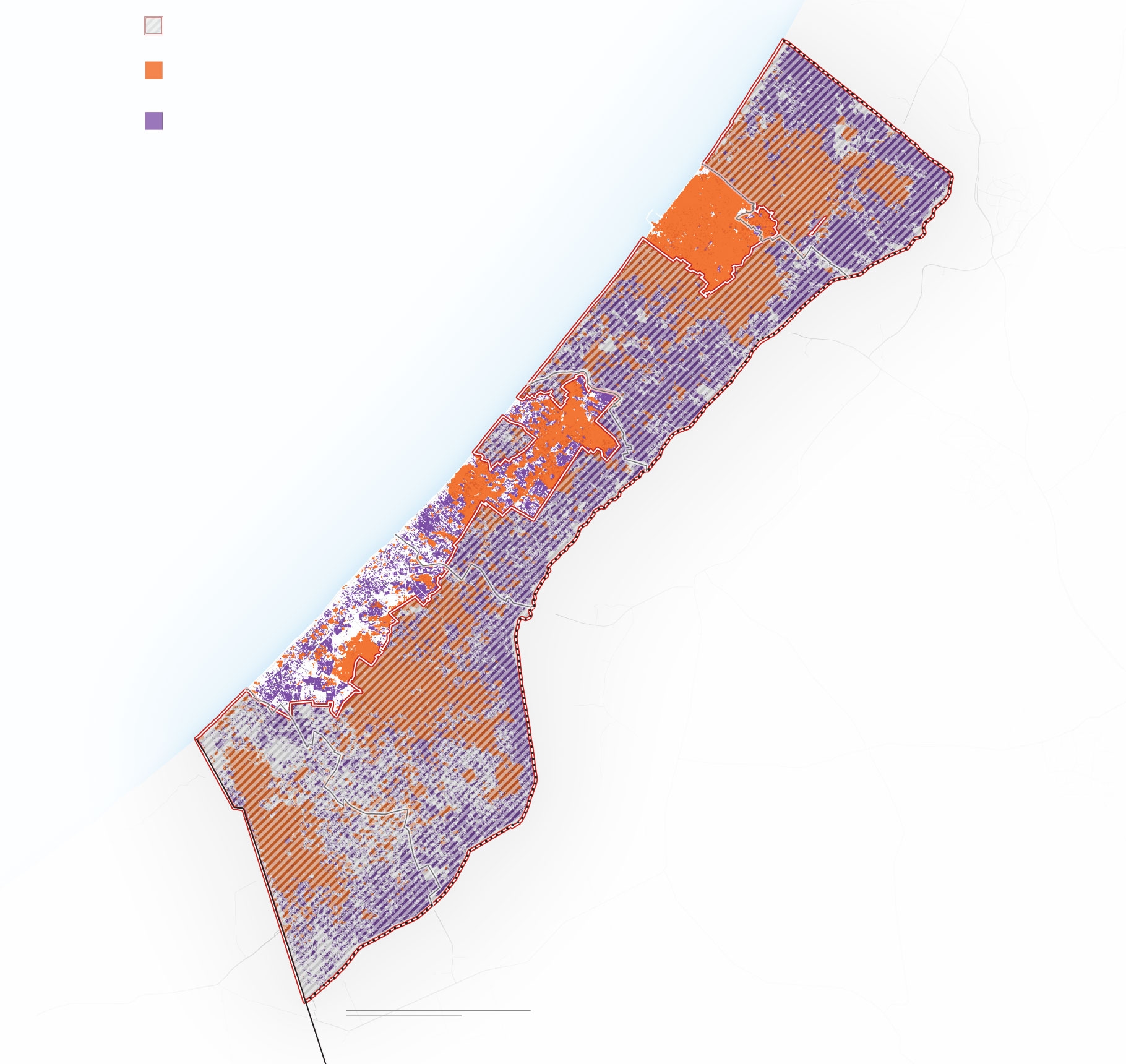 معظم المناطق المتبقية التي لم تصدر فيها أوامر إخلاء أو عسكرة، تضررت بشدة، أظهر تقييم أجراه مركز الدراسات العليا بجامعة مدينة نيويورك أن 60% من المباني دُمِّرت، بينما أفادت وكالة الأمم المتحدة لإغاثة وتشغيل اللاجئين الفلسطينيين (أونروا) أن 92% من المنازل إما تضررت أو دُمرتن وأيضًا فإن 68% من الطرق تضررت، مما يزيد من تعقيد نقل المساعدات في القطاع.