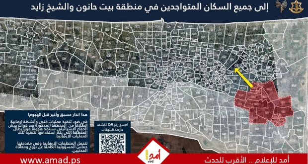غزة:أصدر جيش الاحتلال يوم الخميس، "تحذيرا أخيرا قبل الغارة" إلى جميع سكان قطاع غزة المتواجدين في منطقة بيت حانون والشيخ زايد، بضرورة الإخلاء.